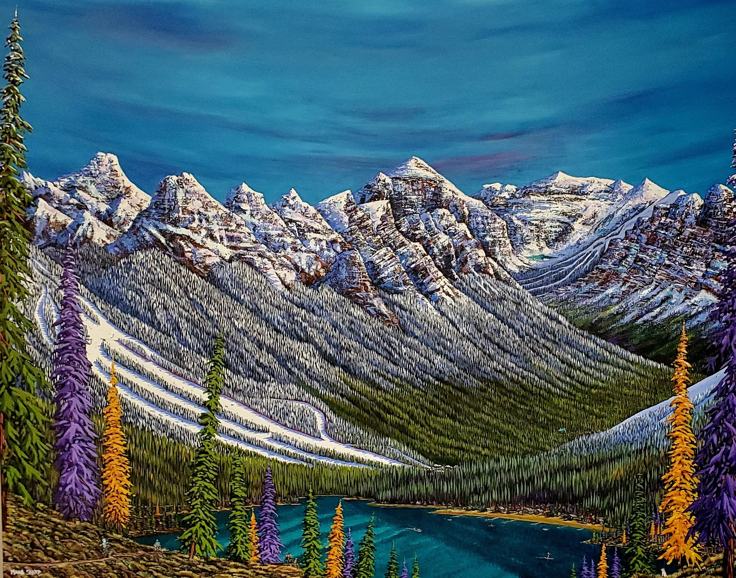 Colorful painting of a mountain landscape with tall trees, a lake, and mountains in the background, signed by Mark Sharp.